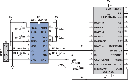 該器件還可以工作于5V或3.3V電源,因此,外設(shè)僅需一個(gè)電源。ADuM4160還具有良好的ESD保護(hù)能力,通常允許在連接器的D+和D-引腳沒有外部保護(hù)電路的情況下熱插拔。