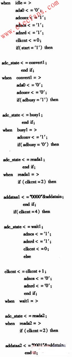 結(jié)合AD7862的轉(zhuǎn)換速度,F(xiàn)PGA選擇1O MHz的處理時(shí)鐘。對于整個(gè)轉(zhuǎn)換過程的控制用一個(gè)狀態(tài)機(jī)來完成,狀態(tài)機(jī)分為12個(gè)狀態(tài) (idie,convert1,busy1,reada1,wait1,reada2,swapchna1,convert2,busy2,readb1,wait2,readb2),其中idle狀態(tài)為空閑等待轉(zhuǎn)換狀態(tài);convertl指示第一次轉(zhuǎn)換啟動狀態(tài);busyl指示第一次轉(zhuǎn)換狀態(tài);resdal狀態(tài)下讀取 VA1;waitl狀態(tài)為讀取VA1和VA2之間的等待狀態(tài);reada2狀態(tài)下讀取VA2;swapchnal狀態(tài)指示交換到另一個(gè)通道進(jìn)行轉(zhuǎn)換;convert2指示第二次轉(zhuǎn)換啟動狀態(tài);剩余狀態(tài)和前面的類似,只不過是針對VB1和VB2而言。設(shè)計(jì)代碼如下(只描述VA1和VA2的部分,剩下的類似):