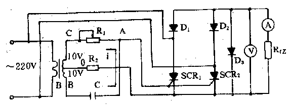 這個電路與一般的阻容觸發(fā)電路賂有不同,它取消了觸發(fā)電壓輸出端的兩個二級管。在頭半個周期中,觸發(fā)電壓同時送到兩個可控硅的控制極上,但只能使受正向陽極電壓的一個可控硅導通,到另半個周期,另一個可控硅導通。改變R1的大小,即改變了觸發(fā)電壓到來的時間,從而改變了可控硅的導通時間,在負載上得到了一個連續(xù)可調(diào)的電壓。
