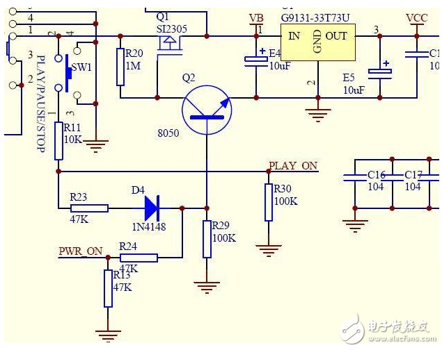 圖中電池的正電通過開關S1接到場效應管Q1的2腳源極,由于Q1是一個P溝道管,它的1腳柵極通過R20電阻提供一個正電位電壓,所以不能通電,電壓不能繼續(xù)通過,3v穩(wěn)壓IC輸入腳得不到電壓所以就不能工作不開機!這時,如果我們按下SW1開機按鍵時,正電通過按鍵、R11、R23、D4加到三極管Q2的基極,三極管Q2的基極得到一個正電位,三極管導通(前面講到三極管的時候已經(jīng)講過),由于三極管的發(fā)射極直接接地,三極管Q2導通就相當于Q1的柵極直接接地,加在它上面的通過R20電阻的電壓就直接入了地,Q1的柵極就從高電位變?yōu)榈碗娢唬琎1導通電就從Q1同過加到3v穩(wěn)壓IC的輸入腳,3v穩(wěn)壓IC就是那個U1輸出3v的工作電壓vcc供給主控,主控通過復位清0,讀取固件程序檢測等一系列動作,輸處一個控制電壓到PWR_ON再通過R24、R13分壓送到Q2的基極,保持Q2一直處于導通狀態(tài),即使你松開開機鍵斷開Q1的基極電壓,這時候有主控送來的控制電壓保持著,Q2也就一直能夠處于導通狀態(tài),Q1就能源源不斷的給3v穩(wěn)壓IC提供工作電壓!SW1還同時通過R11、R30兩個電阻的分壓,給主控PLAY ON腳送去時間長短、次數(shù)不同的控制信號,主控通過固件鑒別是播放、暫停、開機、關機而輸出不同的結果給相應的控制點,以達到不同的工作狀態(tài)!