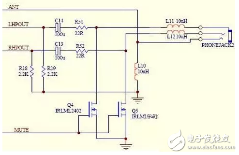 上圖是一個有主控控制耳機有沒有聲音輸出的電路圖,聲音的左右聲道分別通過隔直流電容C13、C14和電阻R51、R52送到耳機孔,但是在電阻R51、R52和耳機孔之間卻接入了一個N溝道的mos場效應管,這個場效應管的柵極連接在一起受著MUTE的控制,當MUTE的地方處于高電位時候,Q4、Q5導通,就會把聲音通過Q4、Q5入地,耳機里就不會有聲音了,當MUTE的地方處于低電位時候,Q4、Q5關斷,聲音就只有通過耳機而發(fā)出聲音了!