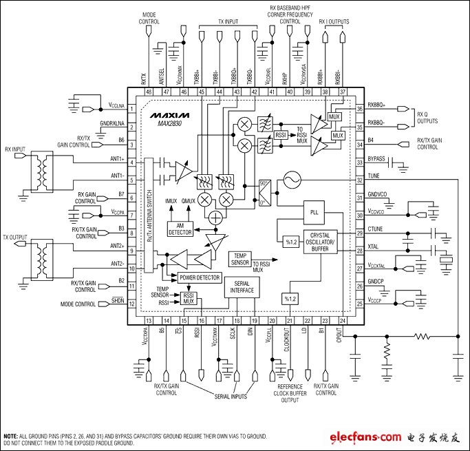 MAX2830直接變頻、零IF RF收發(fā)器設(shè)計(jì)用于2.4GHz至2.5GHz 802.11g/b WLAN應(yīng)用。MAX2830完全集成了實(shí)現(xiàn)RF收發(fā)器功能所需的全部電路,提供RF功率放大器(PA),Rx/Tx和天線切換開關(guān)、RF至基帶接收通道、基帶至RF發(fā)射通道、壓控振蕩器(VCO)、頻率合成器、晶體振蕩器和基帶/控制接口。MAX2830包含具有快速建立時(shí)間的Σ-Δ RF合成器,具有小于20Hz的頻率步長(zhǎng)和數(shù)字調(diào)諧晶體振蕩器,允許使用低成本的晶體。該器件無需I/Q校準(zhǔn);但是該器件集成了片內(nèi)DC偏移消除和I/Q誤碼以及載波泄漏檢測(cè)電路,以提高性能。僅需RF帶通濾波器(BPF)、晶體、一對(duì)非平衡變壓器和少量的無源器件即可構(gòu)建完整的802.11g/b WLAN RF前端解決方案。