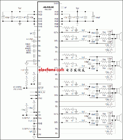 MAX13301結(jié)合可靠的汽車音響系統(tǒng)的綜合診斷硬件的四個高效率D類放大器,并提供高達10%THD + N的每通道進入4Ω80W,當從一個24V電源操作。